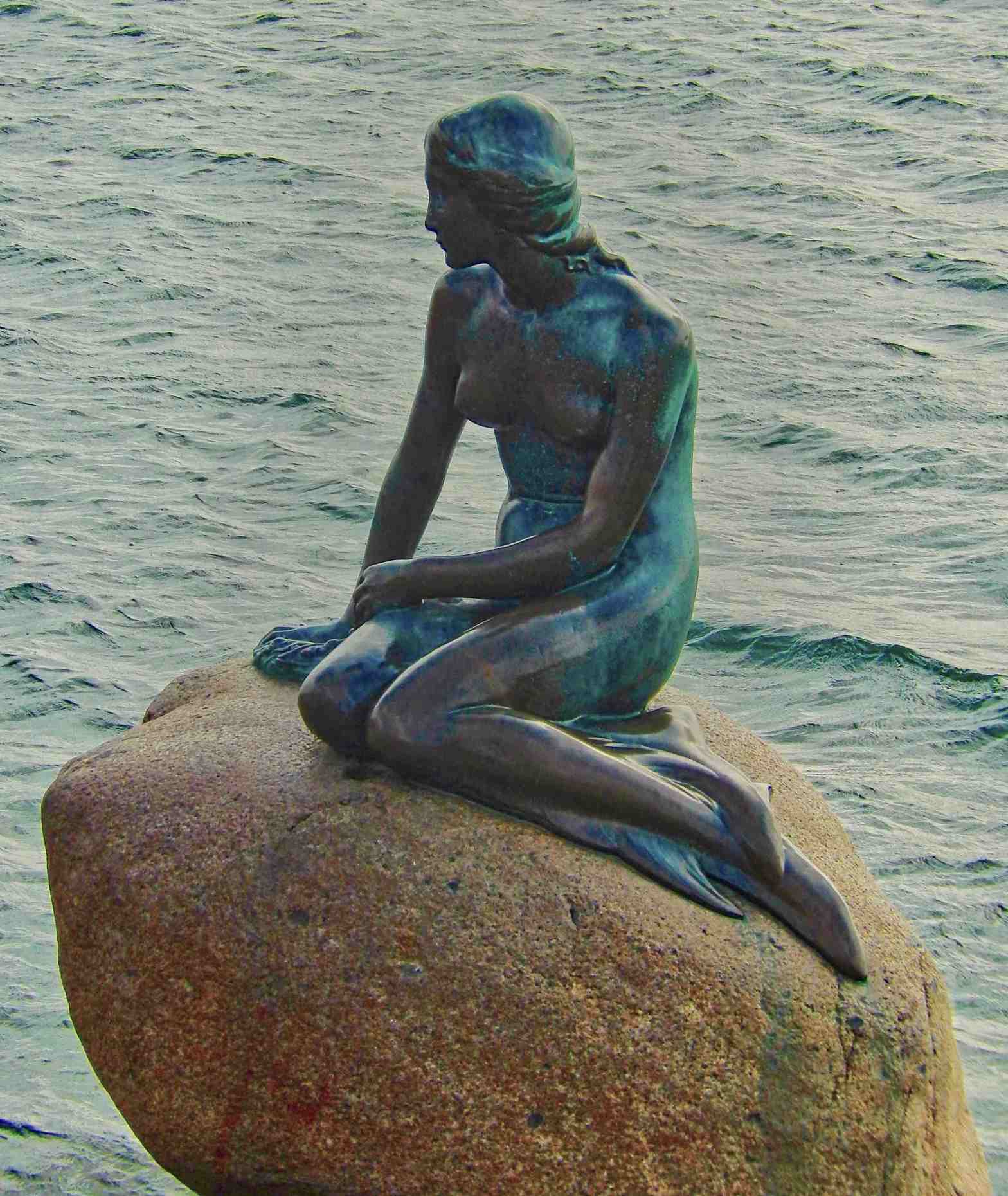 She sits quietly on a rock only a couple of feet from shore depicting a mermaid contemplating becoming human. The Little Mermaid statue is a bronze sculpture by Edvard Eriksen, located at the Langelinie promenade Copenhagen, Denmark.
