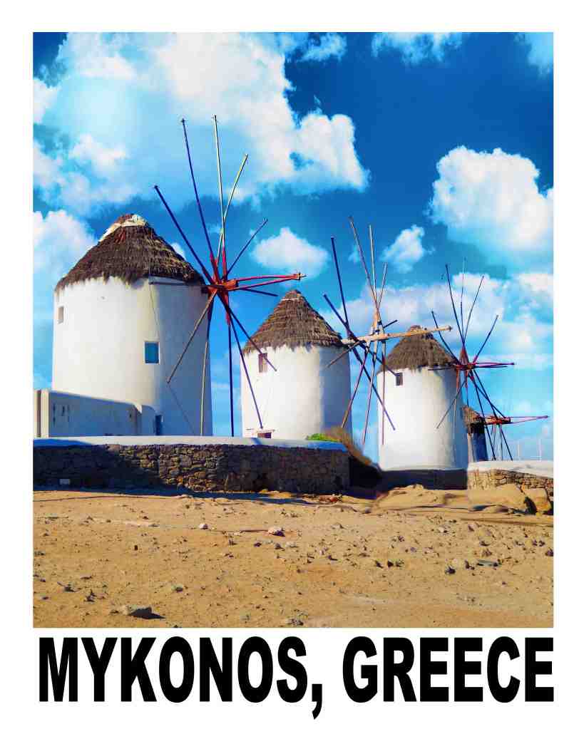 The Iconic Windmills Of Mykonos. Traditionally, these windmills are heavy, three-story buildings made of stone, circular in shape, reflecting the simple yet functional design typical of the Cycladic islands.