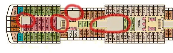 Less important than deck selection for access to the ships various venues because there are usually two or three banks of elevators and stairways and venues are spaced out around the ship. Again the nearer you are to mid-ship the less you will feel the ships motion with bow and stern cabins having the most motion.