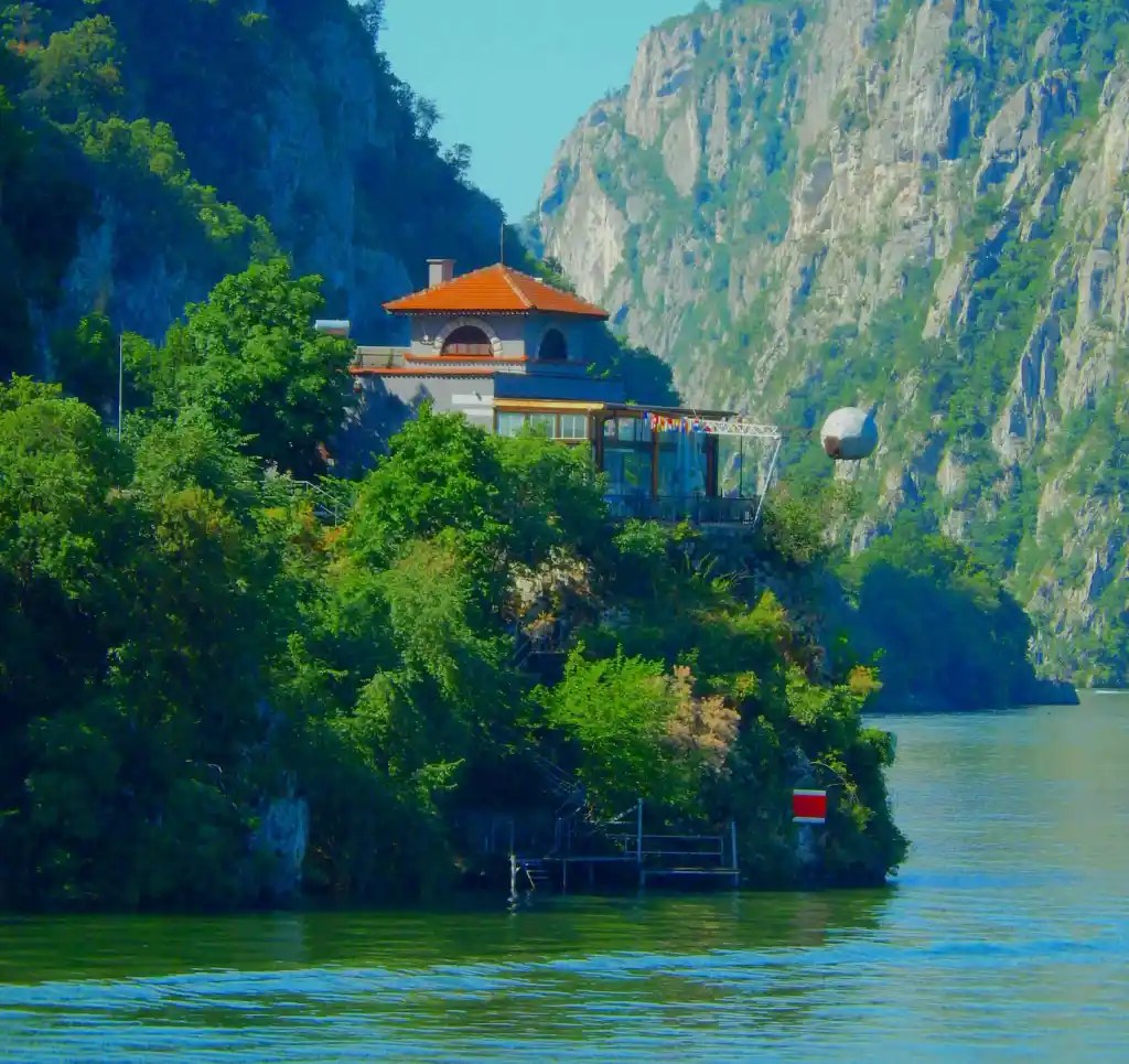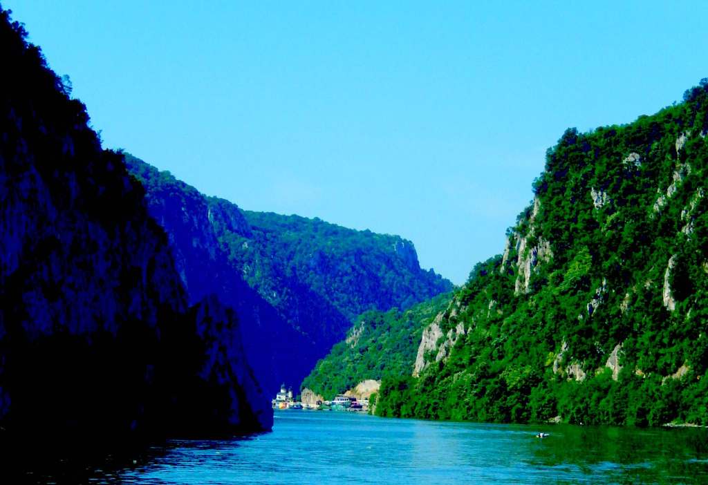 The Iron Gate is a major gorge on the Danube River, located between Romania and Serbia approximately 1,490 miles from the river’s mouth at the Black Sea. It is one of the most spectacular natural landscapes in Europe, characterized by steep cliffs and rugged terrain.