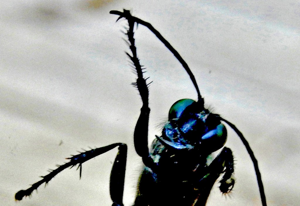 The body is satiny matte black. There is a narrow constriction between thorax and abdomen (it is a “thread-waisted” wasp). The wings are shiny, smoky black, with blue iridescence, usually folded together lengthwise down the back. The legs are long and spiny. The mandibles (mouthparts), usually held together and overlapping, are relatively large and sickle-shaped, with an extra prong in the middle of each curve.