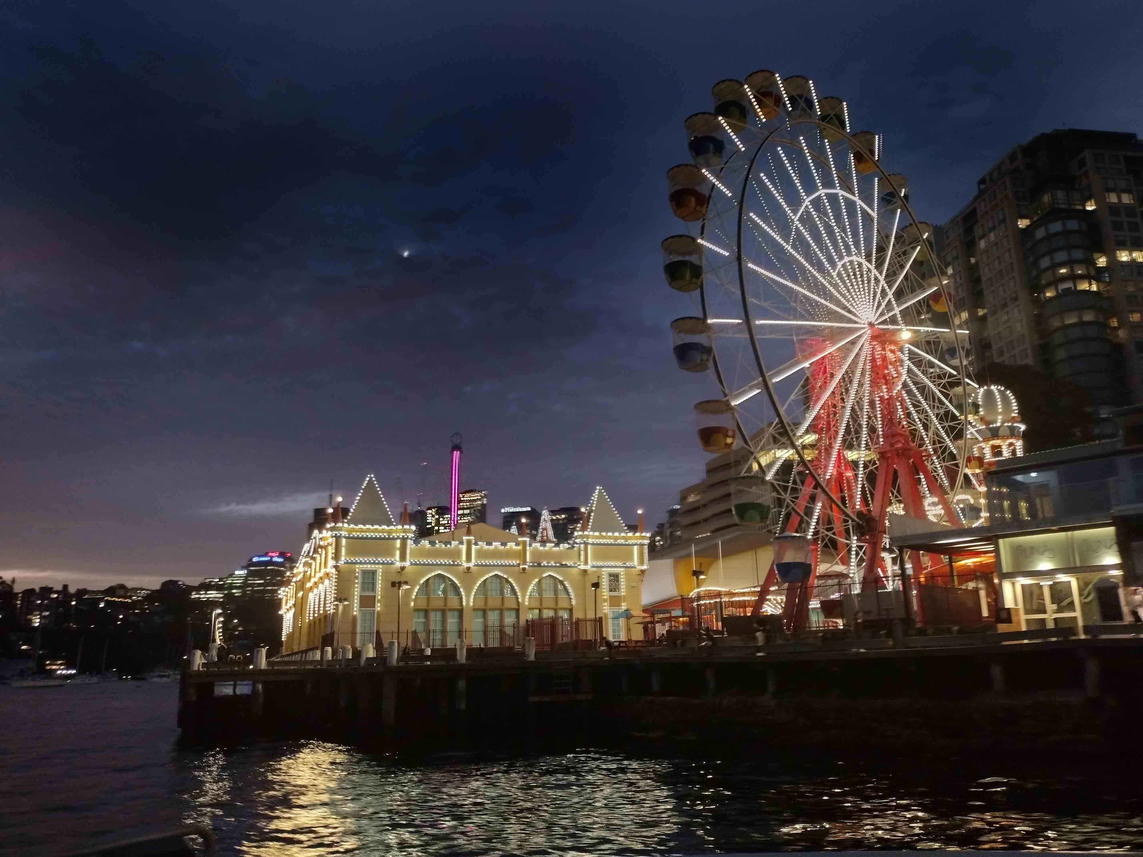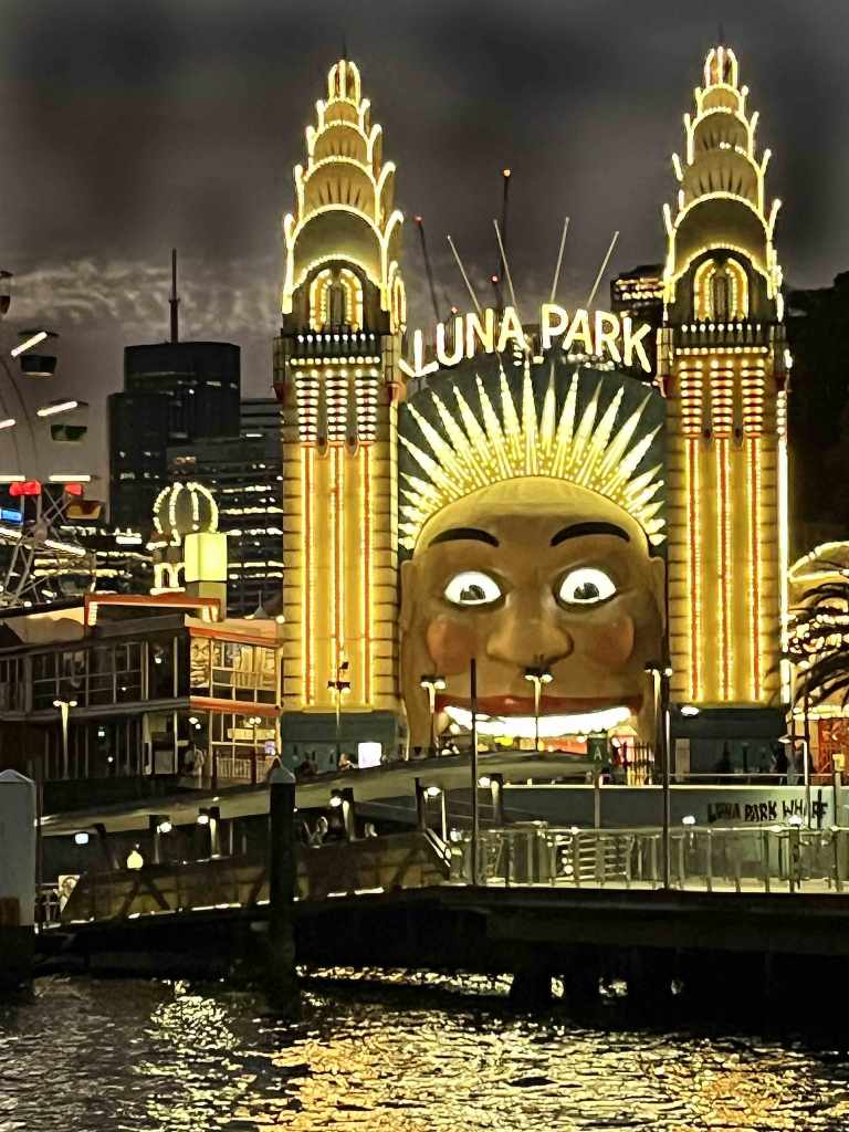 Our first ferry from Circular Quay was to Manly and that offered great night views of the Opera House backed by the CBD skyline. At Manly we didn’t even get off but went right back to Circular Quay. Looking to take another ferry we searched for a route that would take us under the Sydney Harbour Bridge heading west up the waterfront. We looked for a route that would get us over to Darling Harbour but instead found a ferry that was leaving in a couple of minutes, going under the bridge with its’ first stop being Luna Park, the city’s heritage-listed amusement park.