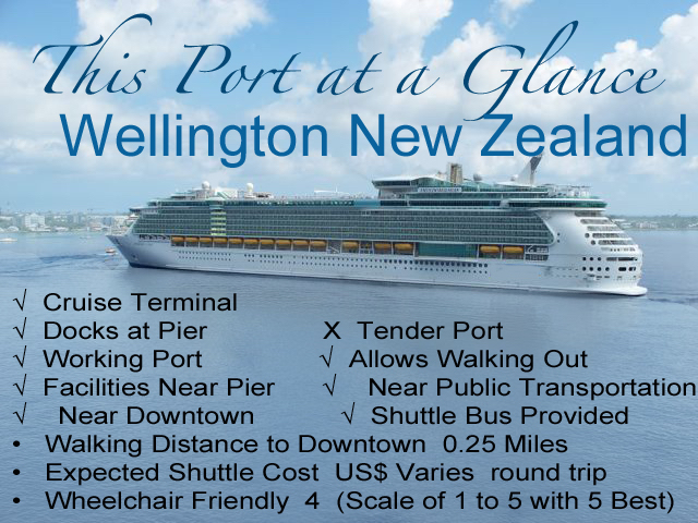 Cruise ships will dock at one of the terminal piers inside CentrePort Wellington. Within the Wellington cruise terminal, is visitor information, free internet and public facilities. Cruise ships will often provide shuttle services from the pier into the city centre with the usual drop off at David Jones department store on the corner of Lambton Quay and Brandon Street.