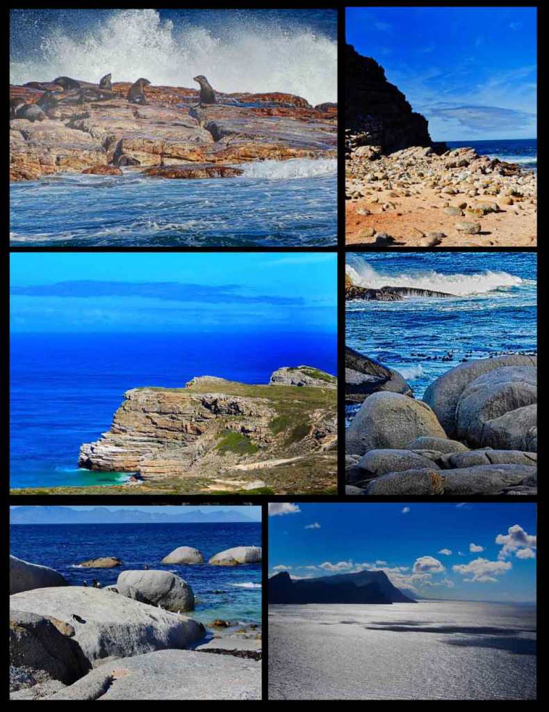 Top Row Left To Right: 1. Seals offshore at the C ape of Good Hope 2. looking south from the Cape of Good Hope. Middle Row: 1. Looking west at the Cape of Good Hope. 2. Kelp beds between boulders. Bottom Row 1. Penguins on the rocks northwest of the Cape of Good Hope. 2. Looking up the coast northwest from the Cape.