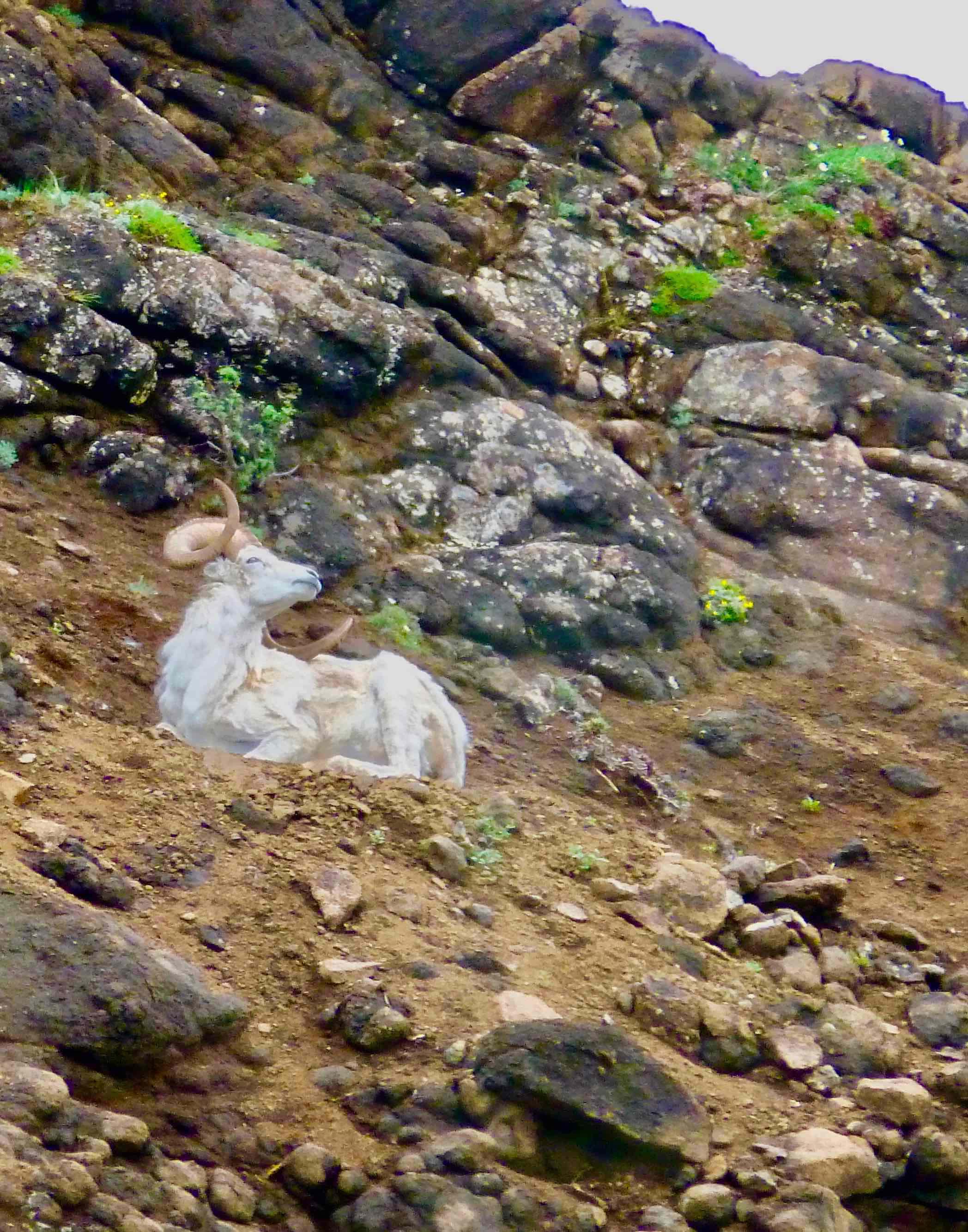 One of the more frequently seen wild animal is the Dahl sheep and the most often spotted are solitary young males who have been driven out of the herd by an alpha male.