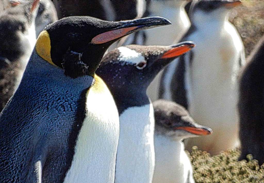 Above: One colony it seemed had adopted a sole King Penguin as one of their own. Looking very much like the Emperor Penguin, the smaller King is the second largest of the penguins and stands a full head above his gentoo friends.