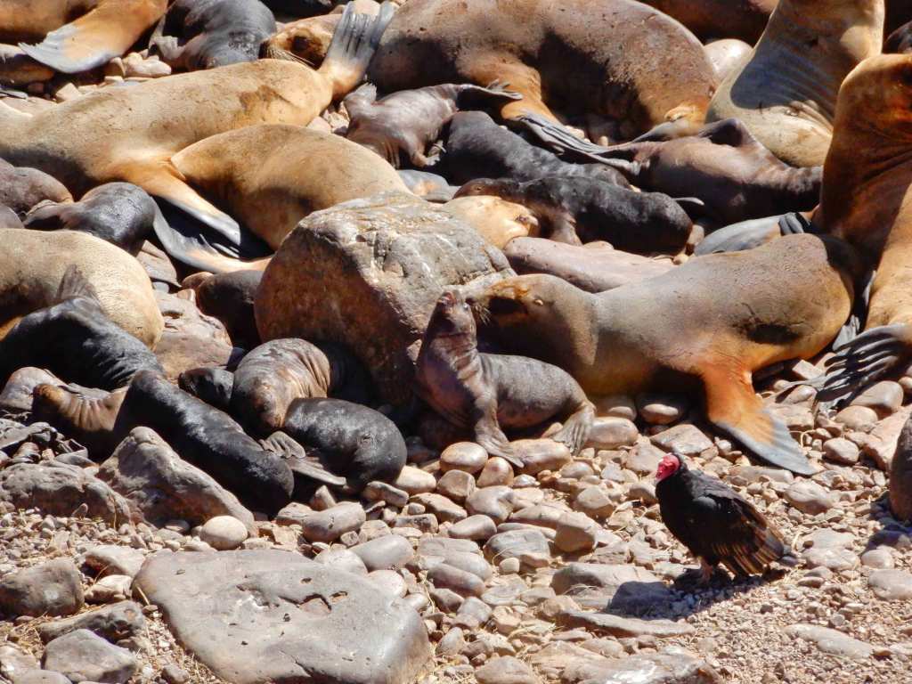 A colony of Sea Lions with dozens of moms and their new pups. In the foreground is a vulture, one of many that were attracted to the afterbirth.
