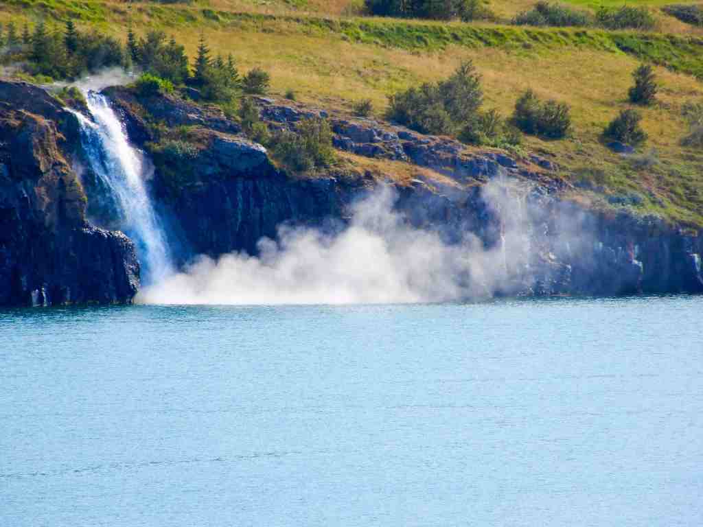 Going to Akureyri on the Eyjafjörður (a fjord) we sail past a very unusual sight – a steaming waterfall plunging into the fjord. Later when inquiring we learn that the Icelandic Highway Department was digging a highway tunnel through a hillside when they hit a boiling water under groumd stream. While there are future plans to use the find to generate electricity, for now they are simple piping it out the the side of the hill to become a boiling waterfall. There is also interest from a company that would like to build a spa on the hillside to take advantage of the free hot water.