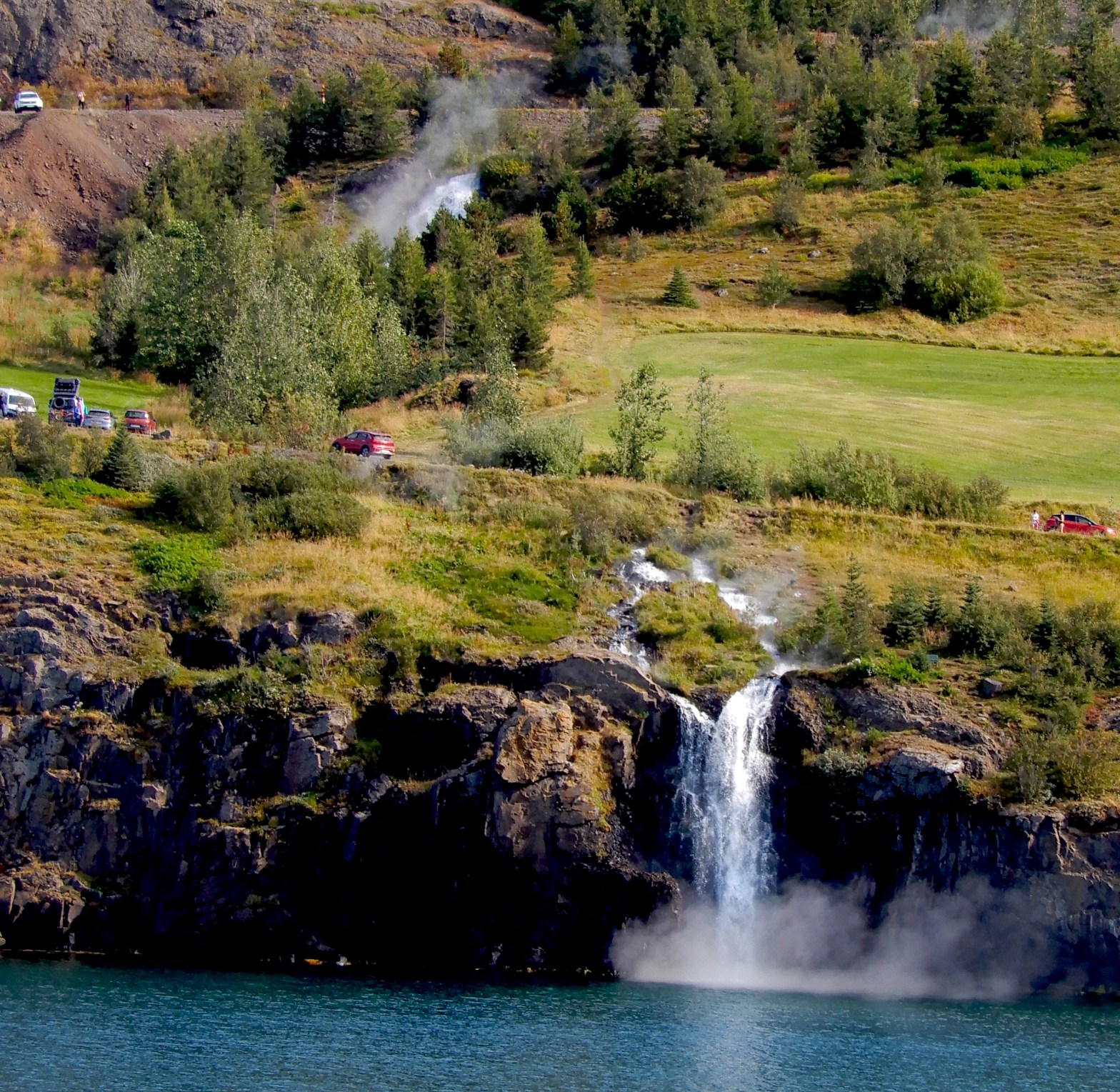Going to Akureyri on the Eyjafjörður (a fjord) we sail past a very unusual sight – a steaming waterfall plunging into the fjord. Later when inquiring we learn that the Icelandic Highway Department was digging a highway tunnel through a hillside when they hit a boiling water under groumd stream. While there are future plans to use the find to generate electricity, for now they are simple piping it out the the side of the hill to become a boiling waterfall. There is also interest from a company that would like to build a spa on the hillside to take advantage of the free hot water.