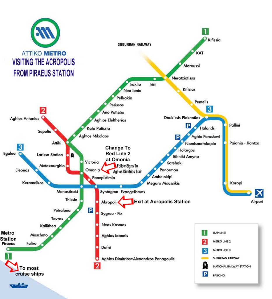 An easy trip from the port of Piraeus into Athens for a visit to the Acropolis is inexpensive and takes about forty minutes each way. The main Piraeus Metro station is located at the back of the port itself and is a fifteen to twenty minute walk from where most cruise ships dock (some cruises may offer a shuttle bus). If you are walking from the pier there is a sky walk over traffic to the subway station location. The Metro (subway) system in Athens offers various kinds of electronic tickets but for a single day trip the best option for a trip into Athens and back is the 90-minute ticket at € 1.90 each way.