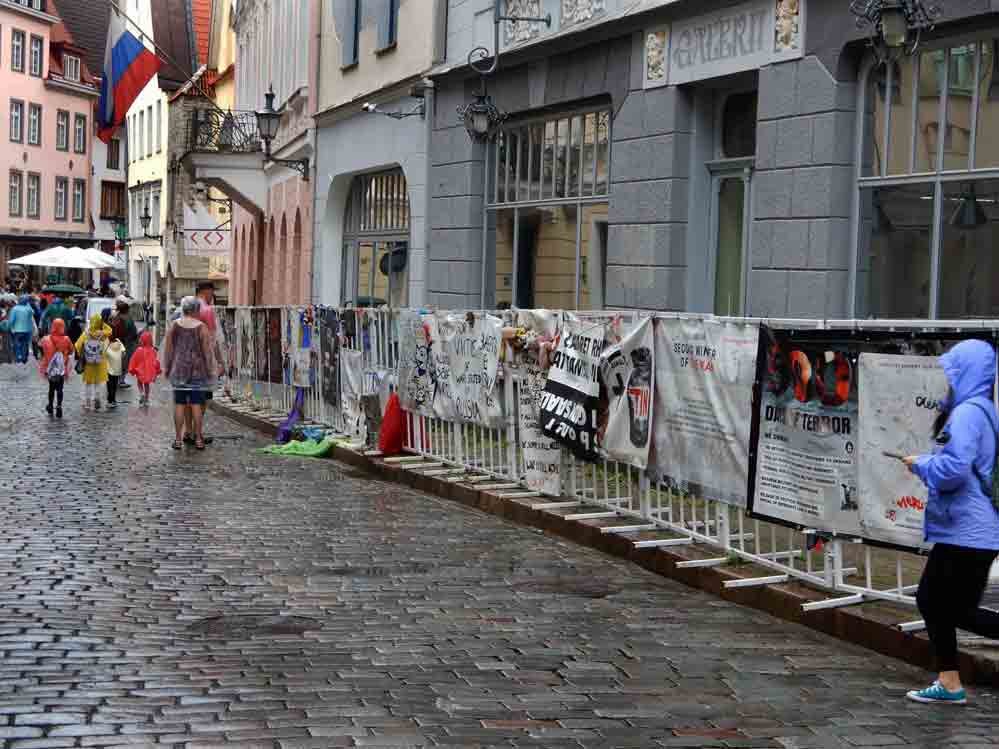 This is the Russian Embassy in Estonia. The fence is intended to keep the Estonians from defacing the embassy and the signs are protesting and condemning Russia’s war in Ukraine. Today there were no typical protesters because of the rain but often there are 50 to a 100 demonstrators outside Russian Embassy.