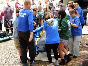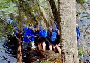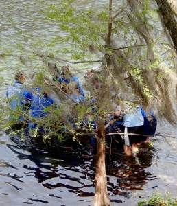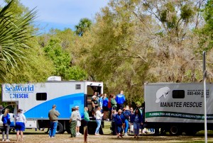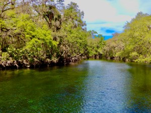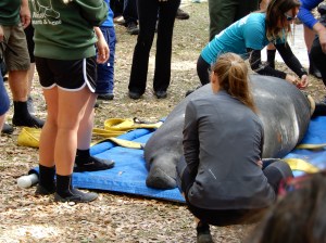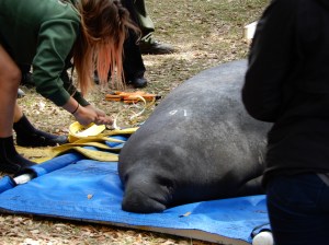 rehabilitation. There were a number of organizations involved in the release including Sea World, The Jacksonville Zoo and the Florida Fish and Wildlife Commission. While we were there a group of volunteers lifted her with a stretcher and walked her into the waters from the spring. As she was placed in the water there were a number of other manatees swimming nearby including several babies.