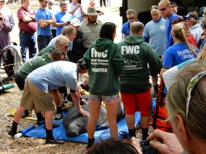 The release that morning was a female who had been rescued weighing under six hundred pounds. She had completely recovered and had gained about three hundred pounds in